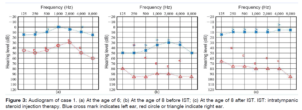 Figure 3: Audiogram of case 1. (a) At the age of 6; (b) At the age of 8 before IST; (c) At the age of 8 after IST. IST: intratympanic steroid injection therapy. Blue cross mark indicates left ear, red circle or triangle indicate right ear.