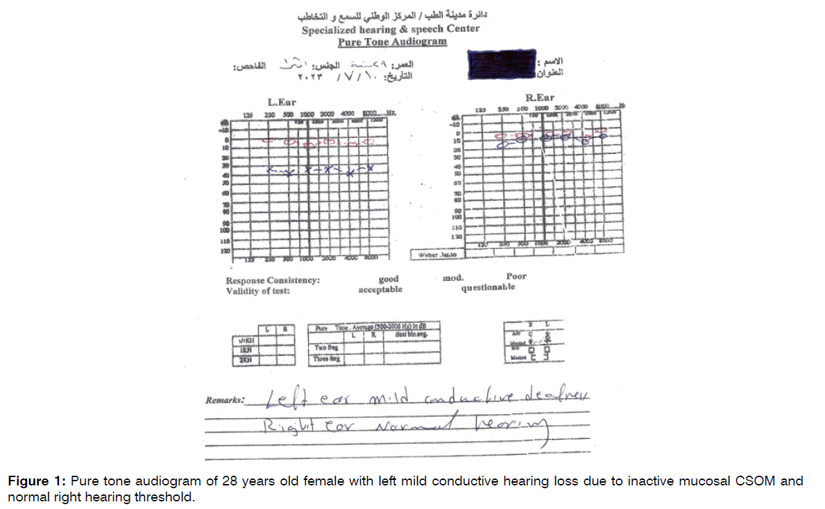 Figure 1: Pure tone audiogram of 28 years old female with left mild conductive hearing loss due to inactive mucosal CSOM and normal right hearing threshold.