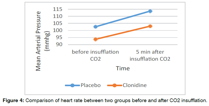 The mean arterial pressure in clonidine group was lower than the placebo group in all times except 15 and 30 minutes after CO2 insufflation, but this difference was statistically significant only at the time of instantly after intubation, before injection, and 5 minutes after insufflation of CO2 Table 3.